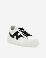 Hogan "H-Stripes" men's leather sneakers, black and white, extra soft nappa leather upper, iconic lateral H, visible stitching, upper edge with stitching on heel, soft padding, 8 mm memory foam footbed, flat cotton laces, logo on tongue, extralight EVA sole with vertical stripes, total height 5.8 cm. Regular fit