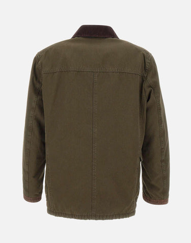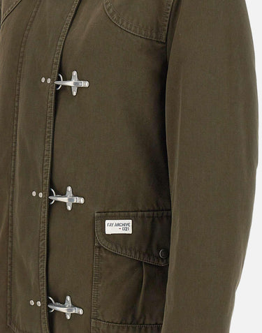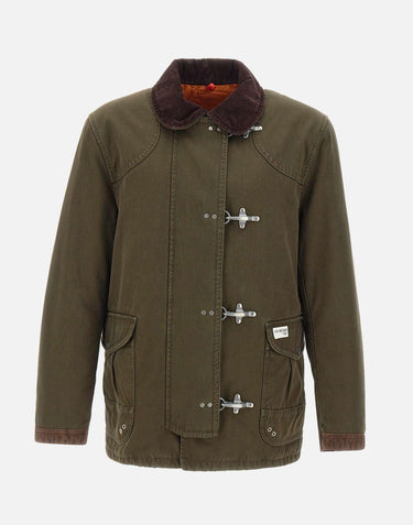 Fay "4 Ganci Archive" jacket in olive green, a true cult piece inspired by 1980s American firefighter uniforms. Crafted from durable cotton cover fabric with quilted onion-pattern lining and padded with wadding for warmth. Features a velvet collar, suede details, signature four-metal-hook closure with hidden snap buttons, and large flap pockets. Finished with the Fay Archive label on the front pocket. Made in Italy. Comfort fit.