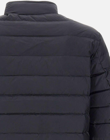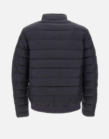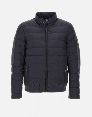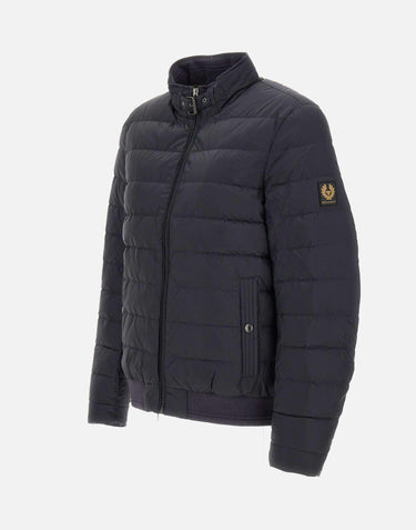 The Belstaff "Circuit Jacket" men's down jacket, available in elegant midnight blue and crafted from high-density water-repellent nylon. Lightweight and compressible, it's perfect for transitional wear or as a mid-layer. It features a front zip fastening, an adjustable chin strap, and two side pockets with multiple stitching and an internal pocket. Ribbed hem and cuffs with zigzag stitching add a distinctive touch. The RDS-certified 750-fill-power down insulation ensures lightweight warmth. Iconic Belstaff phoenix patch on the left sleeve. Regular fit.