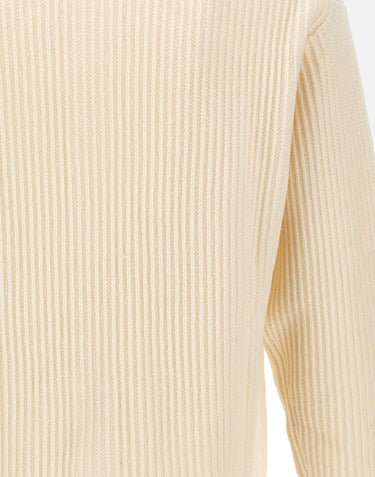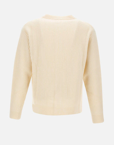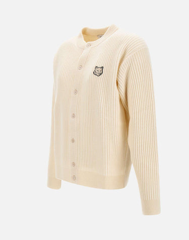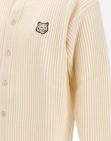Maison Kitsuné "Fox Head" cardigan in cream, crafted from high-quality wool ribbed knit. It features a round neck, long sleeves, and a front closure with tone-on-tone logo buttons. The iconic tonal embroidered fox head on chest adds a distinctive and refined detail. The regular fit makes it perfect for casual-chic looks and transitional wear.