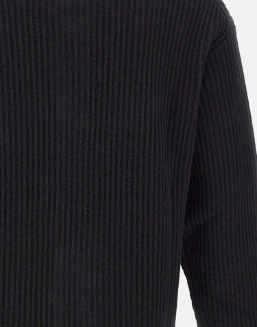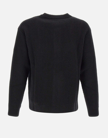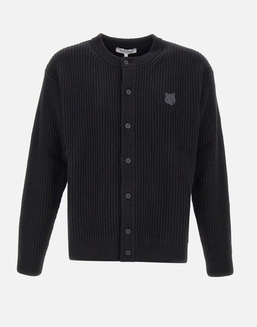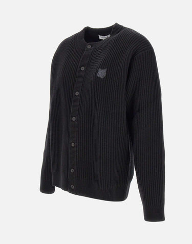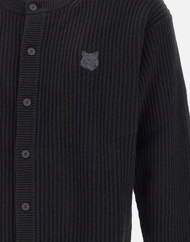 Maison Kitsuné "Fox Head" cardigan in black, crafted from high-quality wool ribbed knit. It features a round neck, long sleeves, and a front closure with tone-on-tone logo buttons. The iconic tonal embroidered fox head on the chest adds a distinctive and refined detail. The regular fit makes it perfect for casual-chic looks and transitional wear.