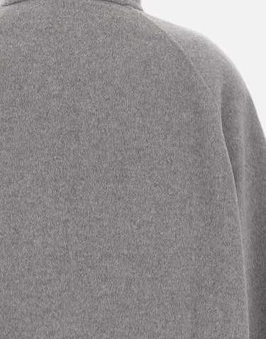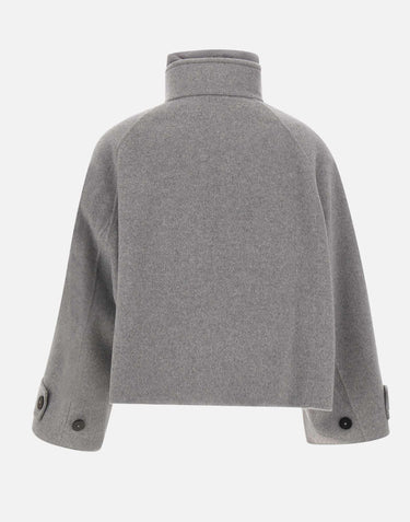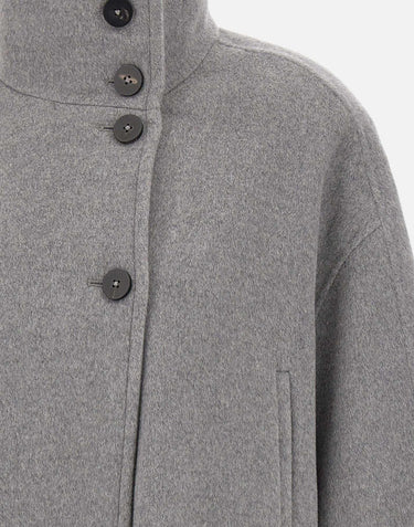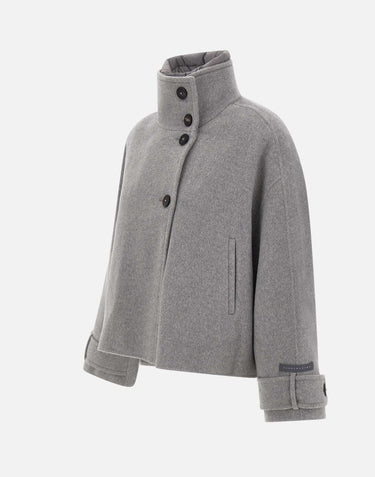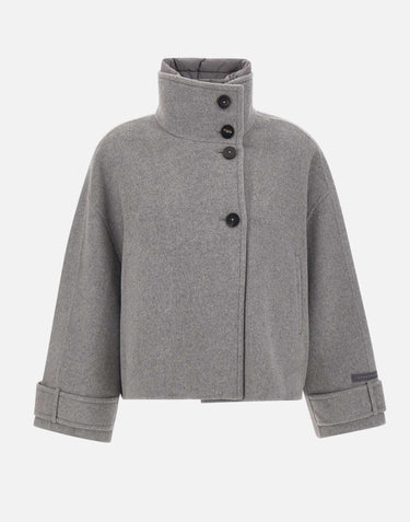 Duno "Dafne" jacket in ecru wool and cashmere, grey color, featuring a two-in-one construction with removable down-filled inner layer for warmth and versatility. Designed with a high collar, contrasting maxi button closure, side welt pockets and wide cuffs with strap and button detail. The flared cut offers a modern, relaxed silhouette, ideal for layered styling.