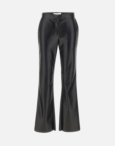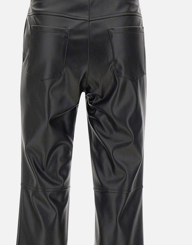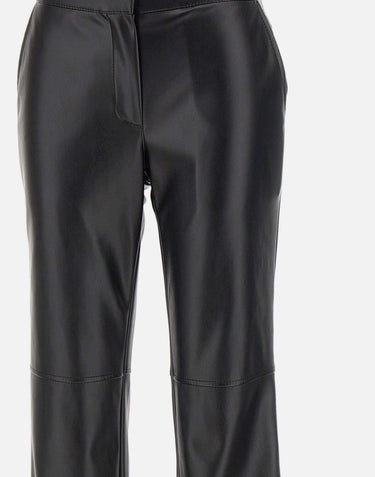 Kaos women's trousers in super-soft faux leather, in black, featuring a modern and feminine design. They feature a zip, hook, and button closure, belt loops, side welt pockets, and back pockets. The tailored mid-leg cut and 21 cm raw hem add a bold and contemporary touch. Regular fit. Made in Italy.