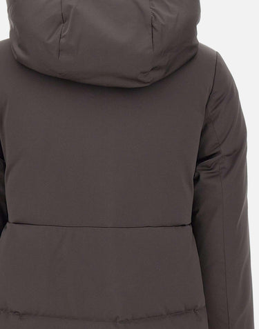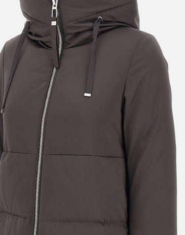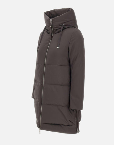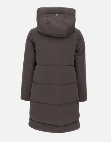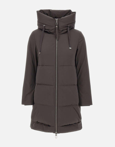 Women's Duno "Talia Mestre" down jacket in satin technical fabric, dark chocolate brown, extra soft, water-repellent, and windproof. Featuring a large hood with drawstring and gold logo trim, a front zip closure, and warm, lightweight down padding. Side pockets with invisible zips and side slits at the hem with zips for optimal comfort and greater freedom of movement. Regular fit for a practical and refined style.