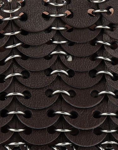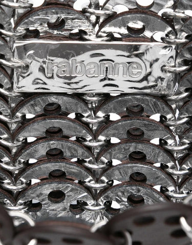 Rabanne "Sac à main" bag, crafted in an elegant dark brown shade with brands iconic leather disc design and silver-tone detailing. Both versatile and sophisticated, it is reversible with a brown side and a silver side to match different looks. Featuring a shoulder strap, it comes with original fabric dust bag and box. Dimensions: 19x10x2.5 cm.