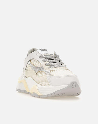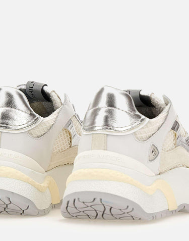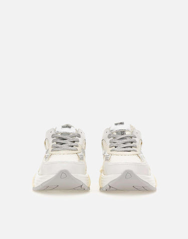 Philippe Model Paris "Odeon" women's sneakers in white, cream, and silver, featuring a contemporary design and bold style, inspired by the urban world. The leather upper features a metallic mesh zigzag embroidery, silver inserts, and the iconic high-frequency shield on the heel and heel counter. Dynamic, milky white platform sole, 6 cm high at the heel. Removable, padded insole, breathable cotton terry lining, and perforated calfskin for added comfort. Protective case included. Handcrafted in Italy. Regular fit.