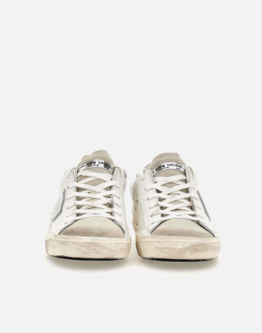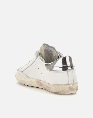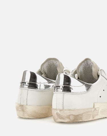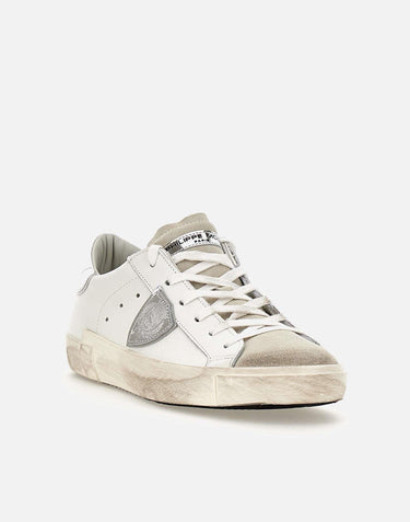 Sneakers donna Philippe Model Paris "PRLD1005", bianche con dettagli argento metallizzato, design giovane, lacci in tinta, punta in suede color ghiaccio, soletta estraibile, fori per favorire la traspirazione, scudetto iconico laterale, logo sul retro e a lato, suola effetto used design asimmetrico alta 2,5 cm. Made in Italy.