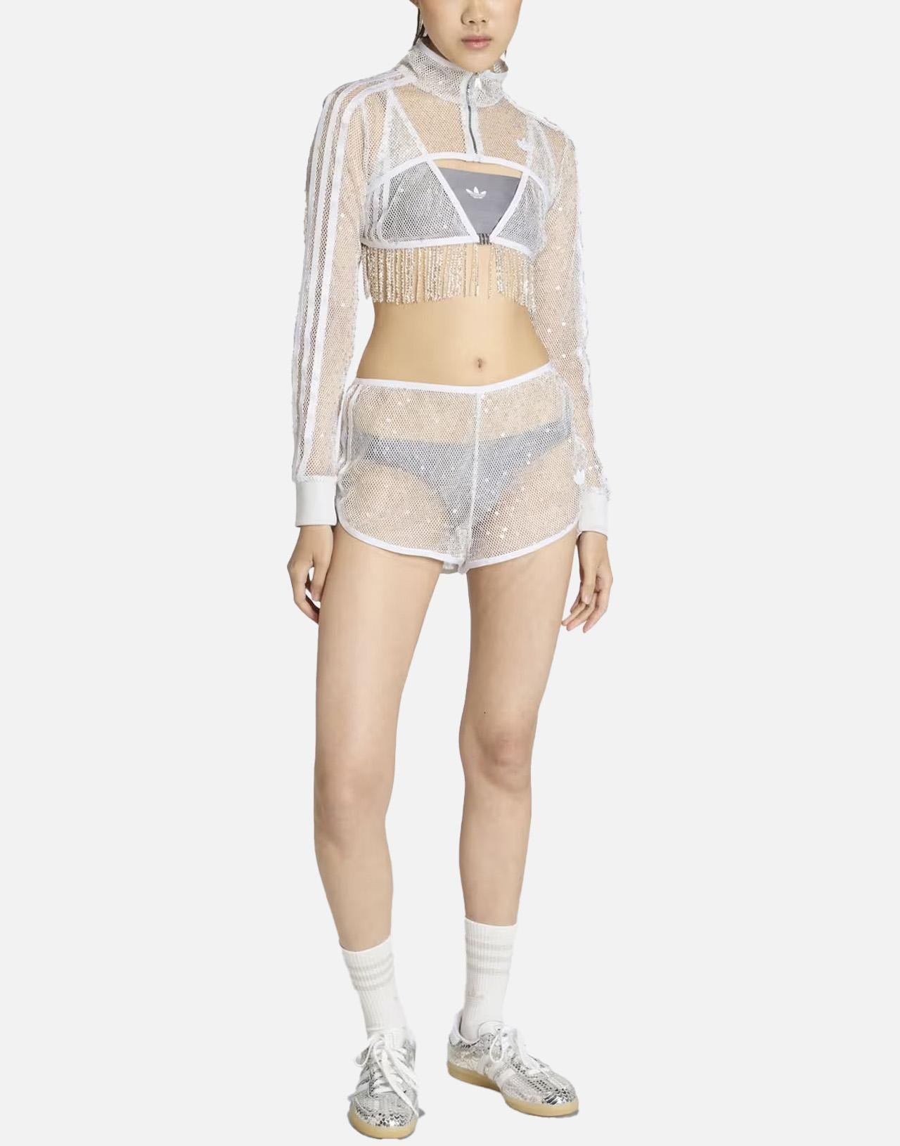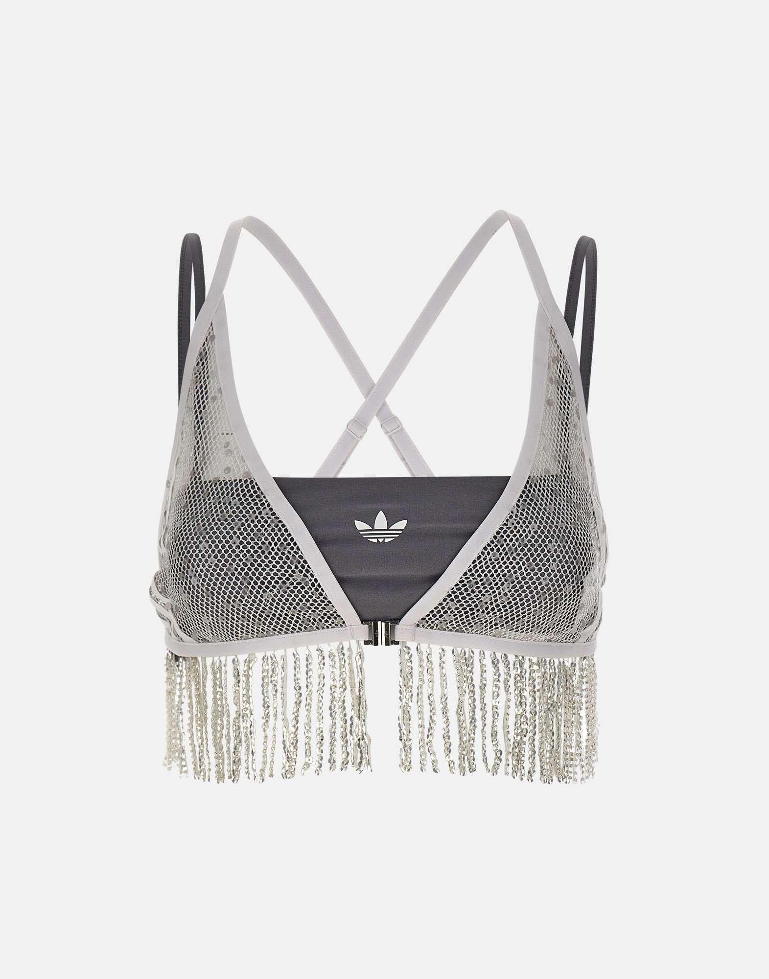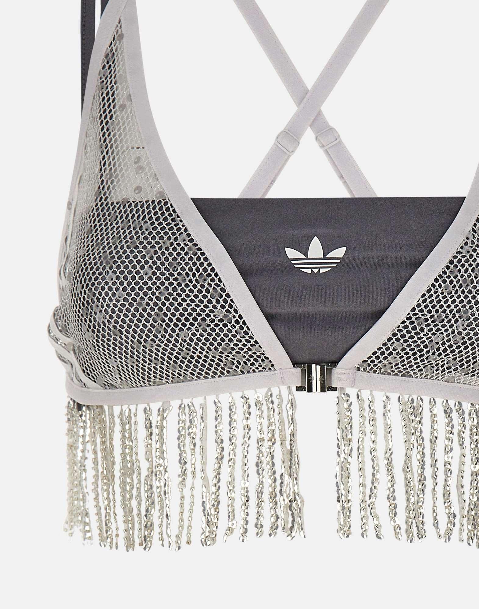 Women's Adidas "Sunset Rhythms" top set composed of two statement pieces with a bold, contemporary aesthetic. The outer bra is crafted from white stretch fabric with a woven construction, embellished with sequins and fringe details along the hem for added movement and shine. The underlying bandeau top comes in dark grey, featuring slim shoulder straps and a white printed logo for a graphic contrast. A striking set designed for standout, fashion-forward looks.
