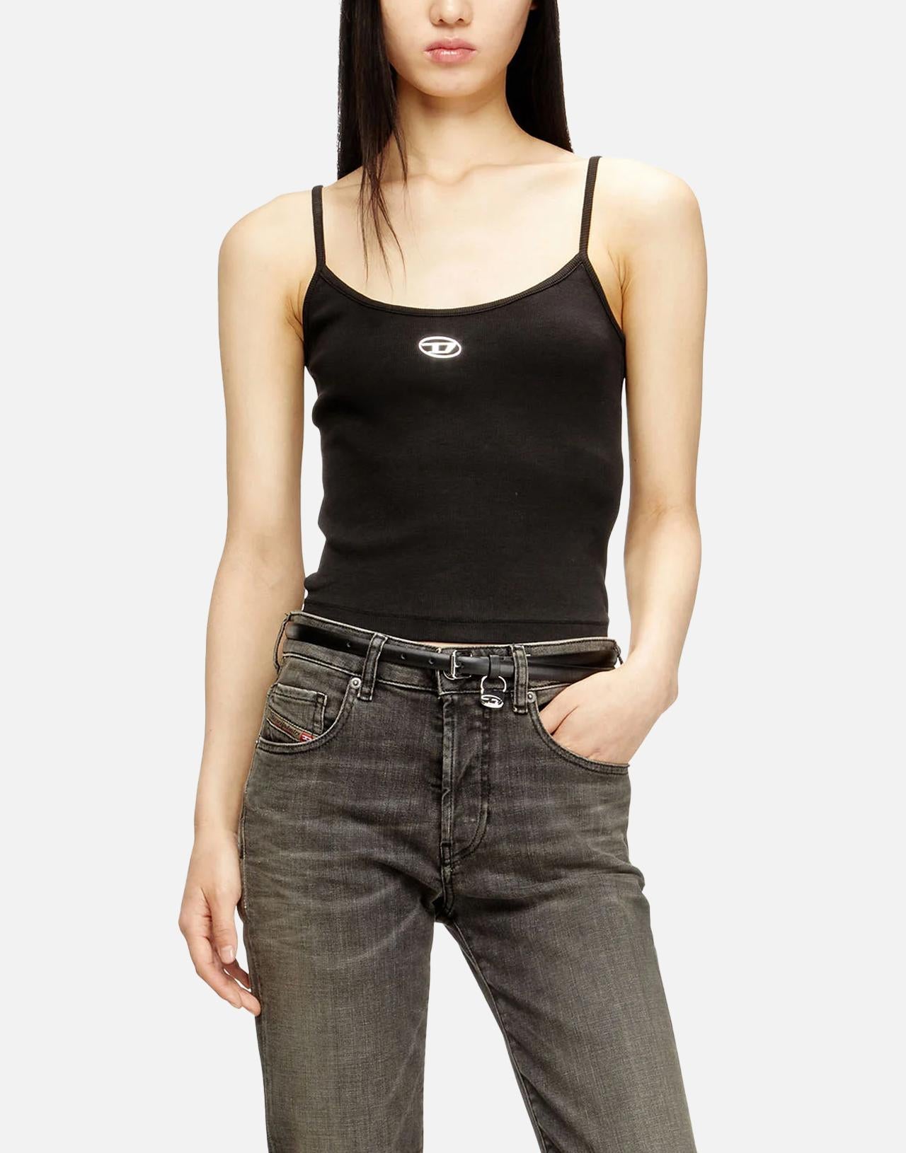 The black Diesel "T-hupy" top is a basic piece with a clean, contemporary design. Made from 100% stretch organic cotton, it guarantees comfort, breathability, and respect for the environment. The model features a classic neckline at the front and back and a regular fit, perfect for a casual yet refined look. The distinctive detail is the silver Oval D Diesel logo at the center front, a symbol of authenticity and urban style.