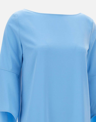 Liu-jo crepe chiffon dress, light blue, tunic model, long sleeves with ruffles, cut-out detail on back with maxi antique gold decorative buttons, ultra-comfortable to wear, regular fit, made in Italy.