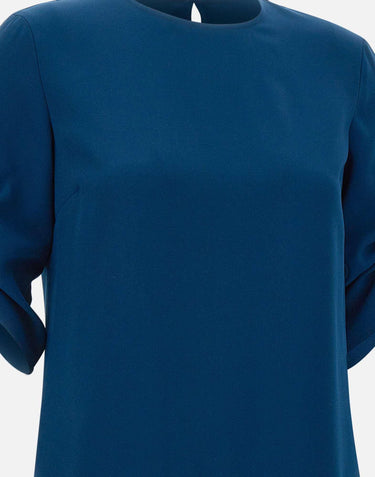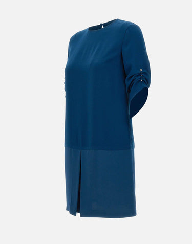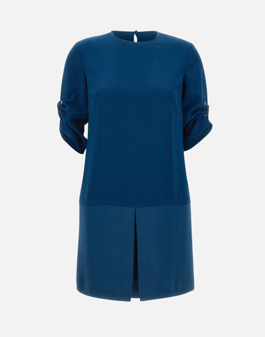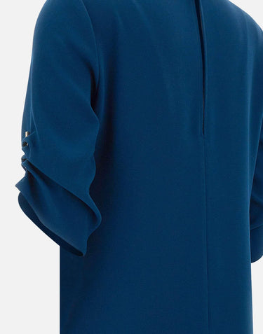 Liu-Jo crepe dress, petrol blue, short sleeves with metal accessory detail that matches hem with a draped effect, contrasting satin insert on hem, button fastening on back on a drop neckline, round neckline on front, regular fit