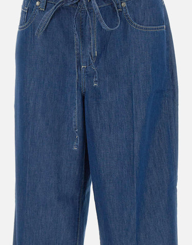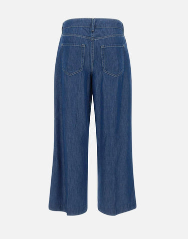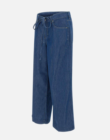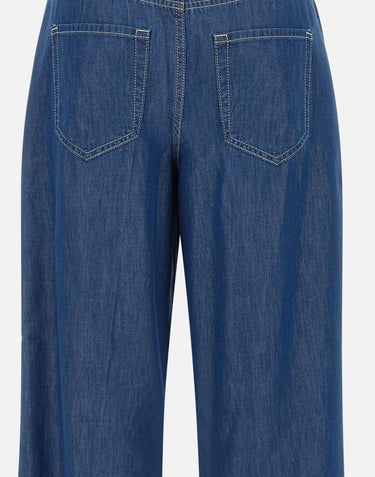 "Autenthic cropped jeans" Liu-Jo, dark wash blue, pressed crease, extra comfort fabric cotton and lyocell, regular waist with belt loops, flare leg with 29cm bottom, five pockets, drawstring waist, logo label on back, button and hidden zip fastening, cropped cut, regular fit