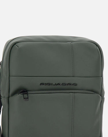 Piquadromixed polyester and cowhide material shoulder bag, green, adjustable shoulder strap, multi-pockets, zip closures, front logo, internal mobile phone pocket, pen holder, iPad® 10.2” holder, iPad® Air 10.9” and iPad®Pro 11”: fixed, dimensions: height 27cm, length 21cm, depth 6cm.