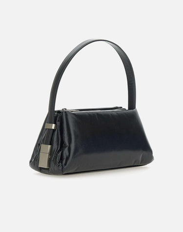 Osoi Pillow mini smooth leather handbag, black colour, top handle, three compartments of which one with central zip and two on sides with magnetic opening, minimalist design, top zip opening, fabric interior, silver galvanic logo, mini logo on the bottom, flat bottom, measurements: 14cm high, 24cm long, 8cm deep, dustbag included.