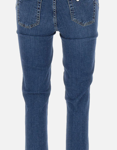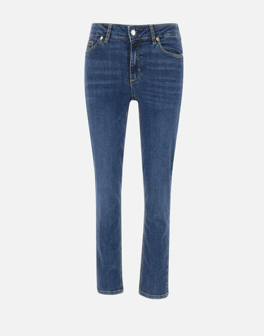 Liu-Jo "Bottom Up Ideal" jeans stylishly enhance silhouette thanks to their bottom-up cut, designed to elegantly lift and redefine figure. Crafted from stretch cotton denim, they feature a dark blue distressed wash for a modern and versatile look. The style features a regular waist with belt loops, a covered zip and logo button closure, and a classic five-pocket construction. The skinny leg tapers towards hem(width 17 cm). The design is completed by a metal logo on the back and a logo tag.