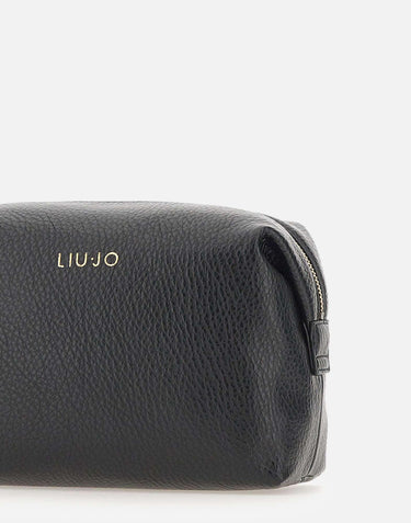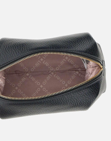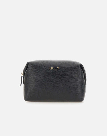 Liu-Jo "Caliwen" clutch bag in black tumbled-effect faux leather, with a compact and elegant design. It features a top zip closure, a metal logo on the front, and gold hardware that adds a touch of sparkle. Complete with a branded lining and dust bag. Ideal for carrying by hand or as an evening bag. Dimensions: 22x10x15 cm.