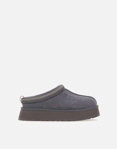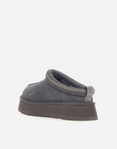 Women's UGG "Tazz II" slippers in soft suede, in gray, with iconic UGG braid trim made from 100% recycled polyester and a pull tab at the back. 10mm sheepskin lining and insole for a warm, soft feel. EVA midsole and EVA outsole derived from sugarcane for lightweight comfort. 4.4cm platform for a contemporary look. Heat-embossed UGG® logo and woven logo label on the insole. Regular fit. Size 8us corresponds to a 39 eu/it. Convert your size using the UGG WOMEN'S FOOTWEAR USA size chart.