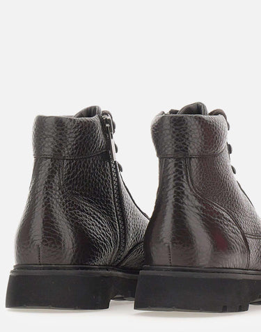 Doucals "Ciro" boots in dark brown grained leather, handcrafted in Italy for timeless style and durability. Features lace-up fastening, gunmetal side zip with logo, visible stitching, and a black rubber lug sole with a 3.5 cm heel. The ankle-high design ensures comfort and versatility. True to size fit. Made in Italy. Dust bag included.