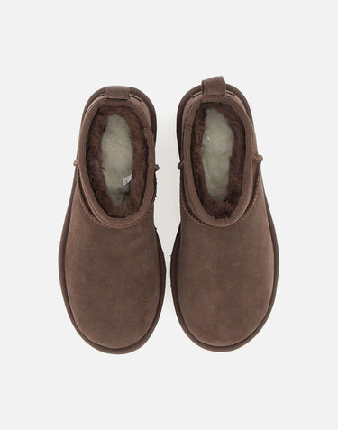 The UGG "Classic Ultra Mini" ankle boot in chocolate reinterprets the iconic UGG model with a lower, more versatile silhouette. The Twinface sheepskin upper with an asymmetric topline, overlock stitching, and a heel pull tab combines tradition and modernity. The 17mm suede heel adds structure and durability, while the UGGplush footbed, made with regenerated wool and lyocell, ensures softness and warmth. The Sugarcane EVA outsole ensures lightweight grip and long-lasting durability. Distinctive detail: the embossed leather UGG logo label on the heel. Shaft height: 3.5" (8.9 cm). Regular fit. Size 8 US corresponds to a 39 EU/IT. Convert your size using the UGG size chart. WOMEN'S FOOTWEAR USA