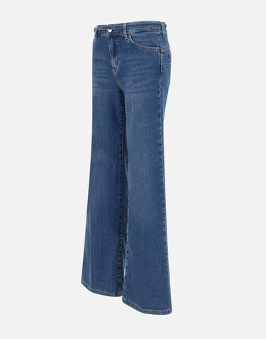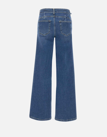 Liu-Jo's "Good Flare" jeans, designed to enhance femininity with a retro touch and contemporary style. Crafted from stretch cotton denim, they ensure a comfortable fit and a slim silhouette thanks to high waist and 25 cm flared leg. The dark blue distressed wash adds depth and character, while classic five-pocket style is enhanced with distinctive details such as metal logo on back and covered zip and logo button closure. A matching tone-on-tone belt with a logo buckle completes the look, perfectly coordinating for an outfit that's meticulously crafted down to smallest details.