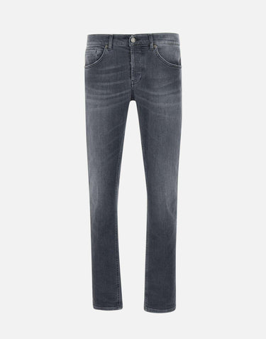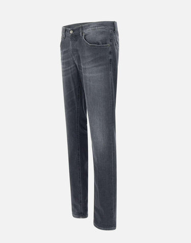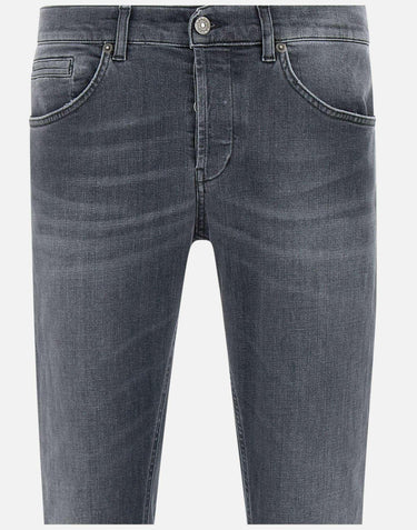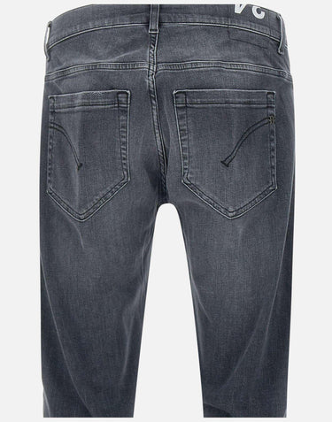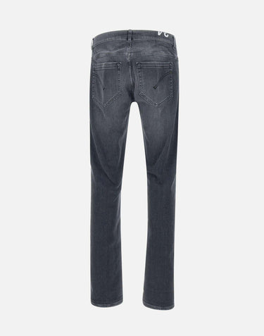 Men's Dondup George stretch cotton denim jeans, black,small destroyed details on profiles, stone washed treatment, five-pocket model, concealed logo button fastening, low waist with belt loops, straight leg with 17cm hem, mini metal D logo on back, skinny fit, made in Italy