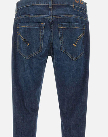 Dondup "George" men's cotton jeans , dark blue with contrasting color stitching, five pockets, closure with logo buttons, waist with belt loops, straight leg with 17cm bottom and turn-up, mini metal D logo on back, skinny fit, made in Italy