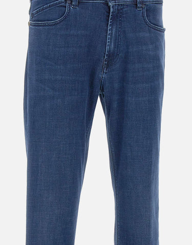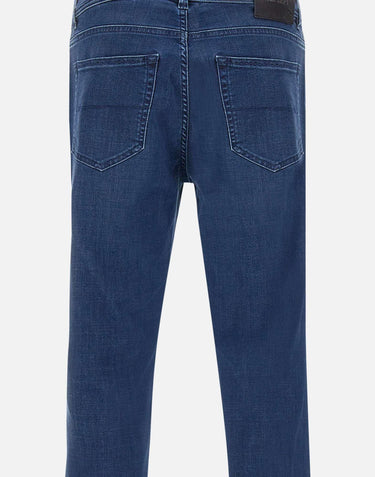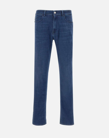 Re-Hash "Hopper" men's jeans, five pockets, dark denim blue, Tencel stretch fabric, logo button and zip fastening, leather logo patch on back, belt loops, slim fit, made in Italy.