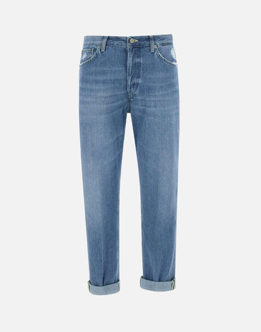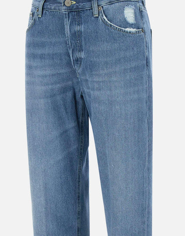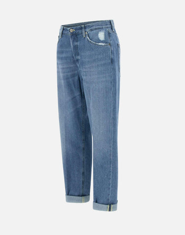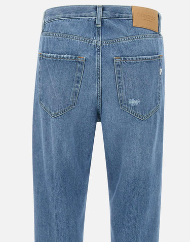 Dondup "Icon" women's jeans, light denim blue medium washed, five-pocket model, small destroyed details, concealed button closure, belt loops, leather logo patch on back, straight leg with 17cm bottom and 3cm cuff, regular fit. Made in Italy.