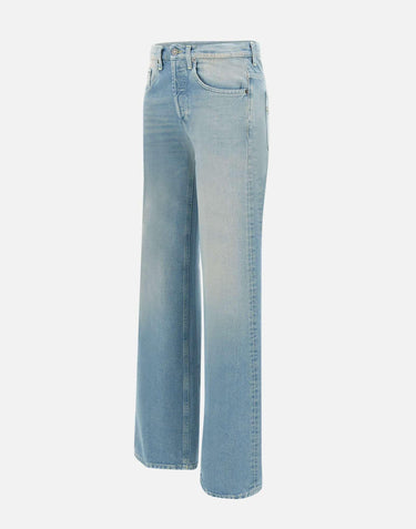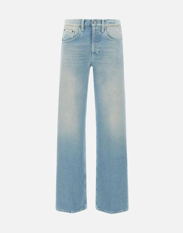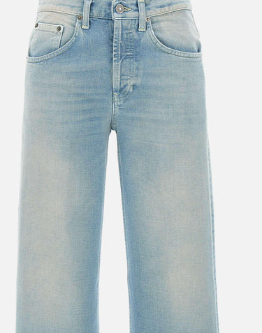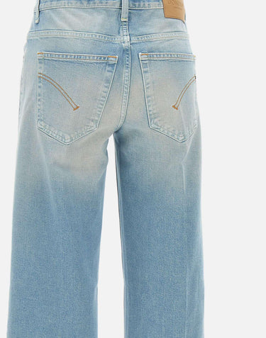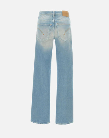 Dondup women's jeans "Jacklyn" , light blue denim with stone washed effect, five-pocket model, silver logo button fastening, low waist with belt loops, mini metal logo initial on back, leather logo patch, straight leg with 23cm hem, loose fit, made in Italy.