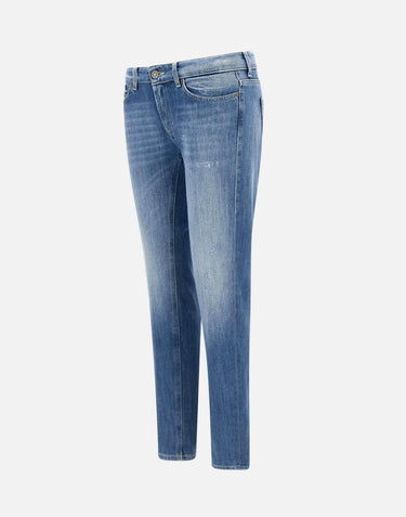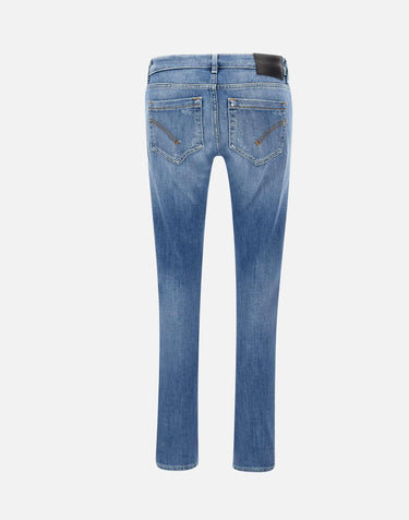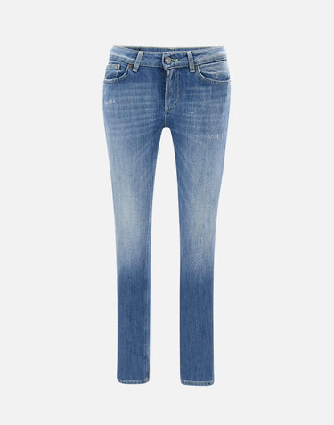 Dondup "Monroe" women's jeans, denim blue with lightening and small destroyed details, five pocket model, low waist with belt loops, logoed button and zip closure, skinny fit, black leather logo patch on back and mini metal logo on pocket. Made in Italy.