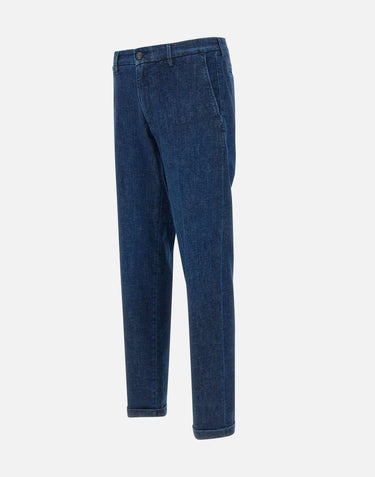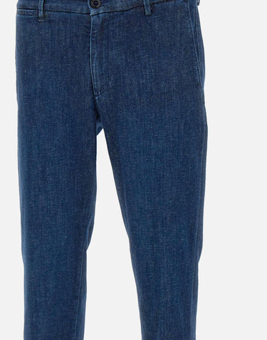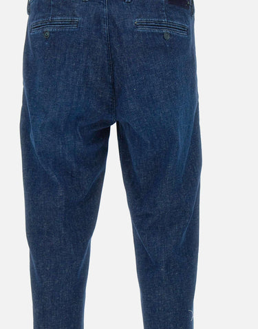 "Mucha Denim" cotton and linen jeans, dark blue, closure with logoed jewel button and zip, waist with belt loops, side pockets, watch pocket, back pockets with buttons, logo patch on the back in suede, 17 cm leg bottom and 2.5 cm turn-up, slim fit, made in Italy.