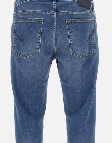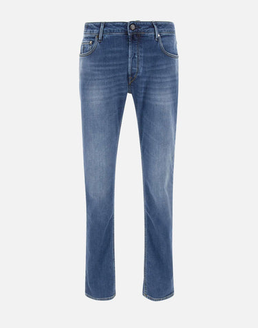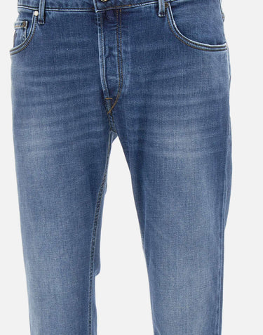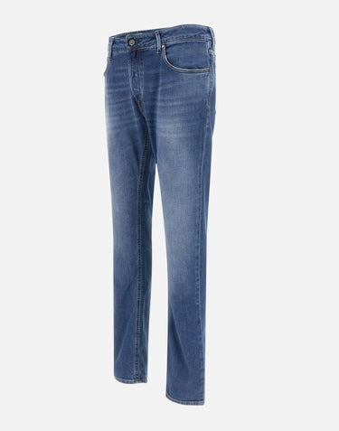 Handpicked "Ravello" jeans in blue denim dyed with premium natural indigo, crafted from stretch cotton for enhanced comfort. Featuring five-pocket construction, embroidered mini logo on watch pocket, leather back patch, and button fly with signature logo button. 17 cm hem and 86 cm inseam (size 34). Slim fit. Made in Italy.