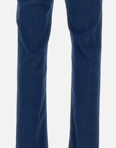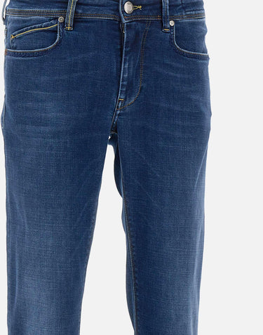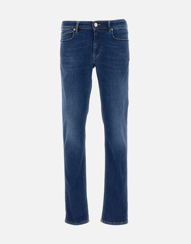 Re-Hash "Rubens-Z" men's jeans, dark denim blue, five-pocket model, medium-low waist, silver logoed button and zip fastening, waist with belt loops, tan-colored suede logo patch on back, slim fit. Made in Italy.