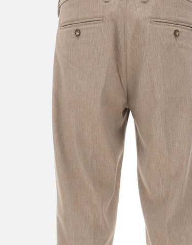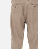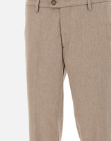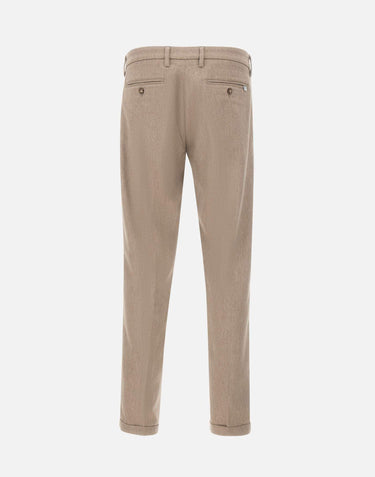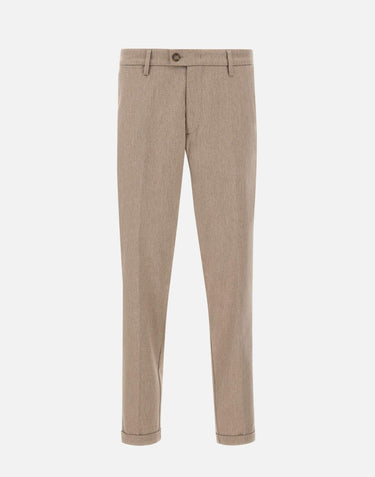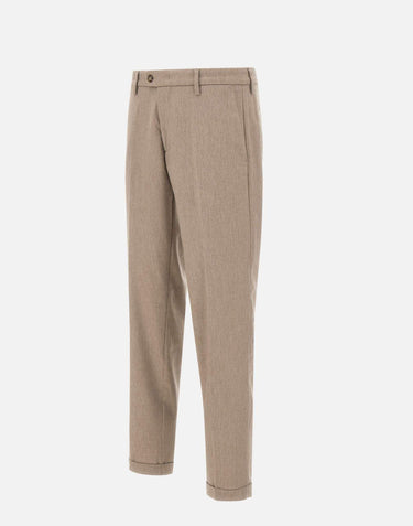 The "Mucha10G" trousers by Re-Hash embody essence of modern Italian tailoring. Crafted from a refined wool and stretch viscose blend, they guarantee comfort and freedom of movement without sacrificing elegance. Available in a warm sand hue, they're ideal for business or formal looks with a contemporary cut. The design features a zip, hook, and button closure, side welt pockets, back button pockets, and a 17 cm hem with a 3 cm cuff for a distinctive tailored detail. The slim fit flatters the figure without constraints. Entirely made in Italy, they're an essential piece for any quality men's wardrobe.