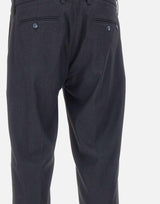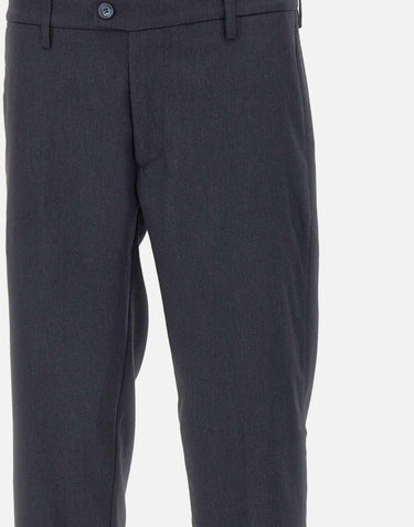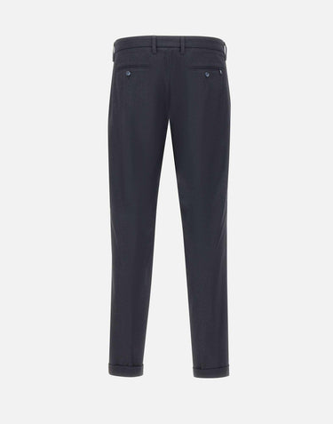 The "Mucha10G" trousers by Re-Hash embody essence of modern Italian tailoring. Crafted from a refined wool and stretch viscose blend, they guarantee comfort and freedom of movement without sacrificing elegance. Available in a sleek shade of blue, they're ideal for business or formal looks with a contemporary cut. The design features a zip, hook, and button closure, side welt pockets, back button pockets, and a 17 cm hem with a 3 cm turn-up for a distinctive tailored detail. The slim fit flatters the figure without constraints. Entirely made in Italy, they're a quality essential for any man's wardrobe.