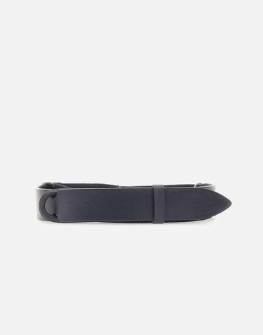 Orciani "Nobuckle bul" belt, blue, in leather with a fabric backing, featuring a simple and modern design without a buckle. Featuring a sliding ring with a matte nickel-free finish, it is one size fits all, adjustable from size 42 to 56, ideal for a variety of wearability. 3 cm wide, expertly crafted. A versatile and refined accessory, perfect for casual or formal looks. Made in Italy.