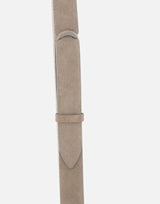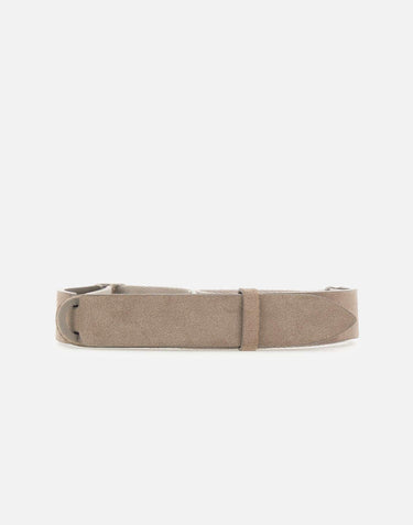 Orciani "Nobuckle" belt in grey mud suede and fabric, featuring a sleek, minimalist design with sliding ring closure and matte nickel-free finish. Adjustable one size, 3 cm height, ideal for refined casual looks. Made in Italy.
