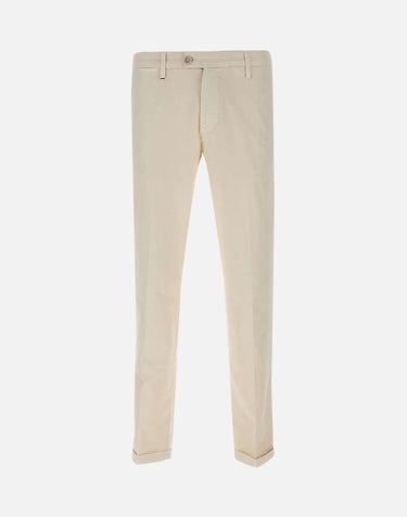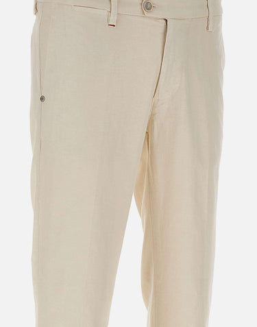 Re-Hash "Mucha" men's cotton and linen pants, cream color, button and zip closure, two side welt pockets, silver metallic mini logo patch, turn-up at hem, waist with belt loops, two back pockets with buttons, slim fit . Made in Italy.