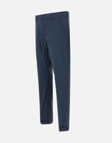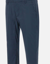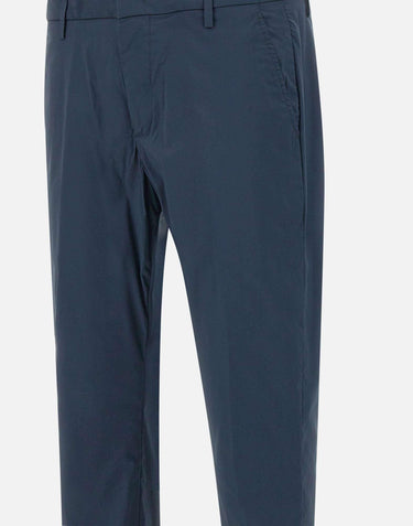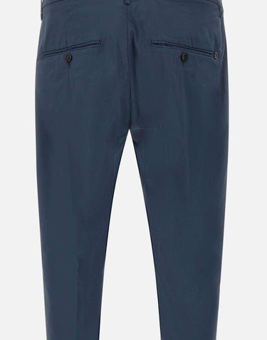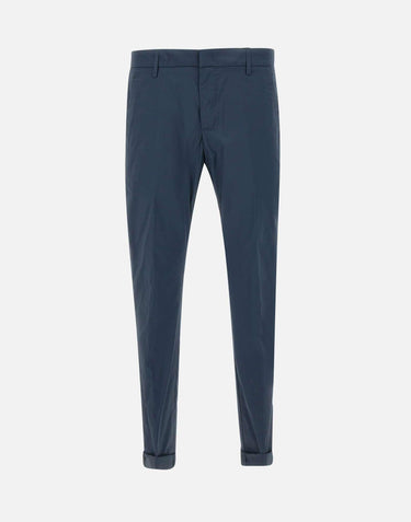 Dondup Gaubert men's stretch cotton blend trousers, blue, welt side pockets, zip and button fastening, slim fit, single breasted back pockets with buttons, belt loops, mini metal logo on back, 18cm turn-up at hem with 4cm turn-up, comfortable and practical, perfect for the spring and summer season. Made in Italy.