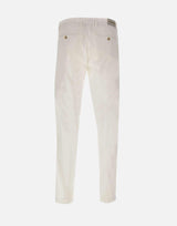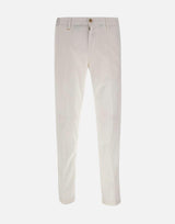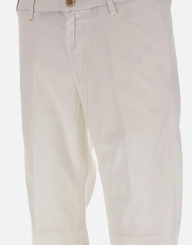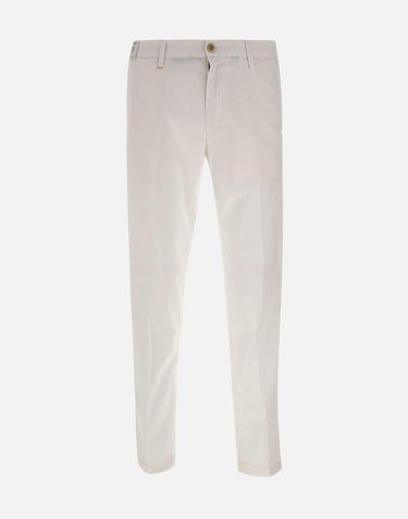Re-Hash "Mucha Chinos" men's cotton blend trousers, white, extracomfort fabric, zip and logo button closure, side welt pockets, single welt pockets on back with button, bottom with 2.5cm turn-up, slim fit. Made in Italy