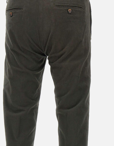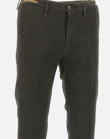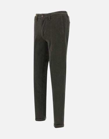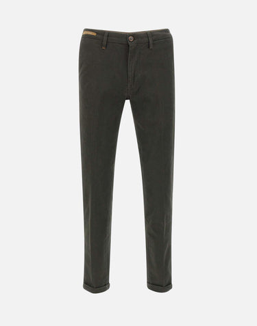 Re-Hash "Mucha Easy weat" men's stretch cotton trousers, forest green, side welt pockets, fabric extra comfortable to touch and to wear, zip and logo button closure, waist with belt loops, logo patch on back in suede , back pockets with button, turn-up at hem, luxury buttons, slim fit, made in Italy.