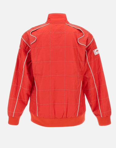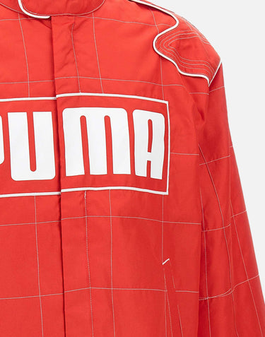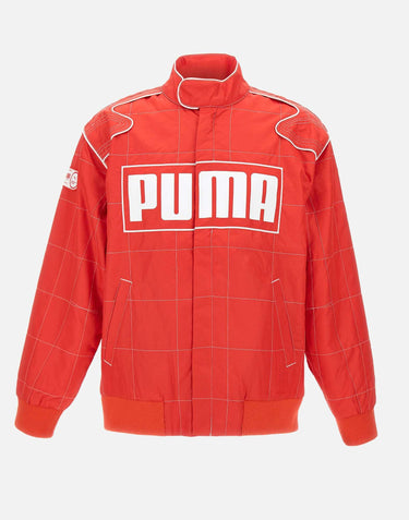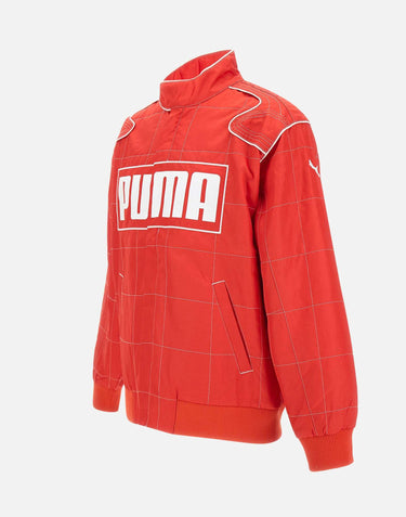 Puma men's "Racer jkt", red, twill construction, regular length, eco-friendly padding, high neck with Velcro fastening, zip fastening, side welt pockets, PUMA logos, ribbed edges, windCELL technology designed to protect from the wind and ensure maximum comfort during movement, oversize fit.