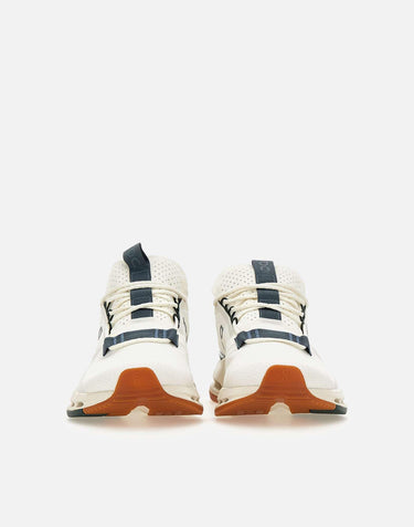 On "Cloud Nova2" men's sneakers, white with olive green details, recycled polyester and spandex upper, weight 314.6 grams, original and bold design, speedboard connected to heel for greater stability, 50% bio-attributed Zero-Gravity foam midsole, light sole 4cm high, logo on tongue and side. Fits small: we recommend at least a half size up. Size US 10 corresponds to EU/IT 44. Convert your size with conversion table: ON MEN'S FOOTWEAR USA