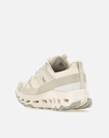 On "Cloudhorizon Waterproof" sneakers in cream, weighing 357 g, designed for hiking with CloudTec Phase technology ensuring smooth, stable cushioning. Features Missiongrip rubber outsole for traction on wet and dry surfaces, waterproof membrane to keep rain out, and Helion superfoam for superior impact absorption. Crafted in soft, flexible technical mesh for stability from heel to toe. Drop 6 mm, lace-up closure, and side logo details. True to size fit: US 8 corresponds to EU/IT 39. Check tON WOMENS SHOES USA size chart for your perfect fit.