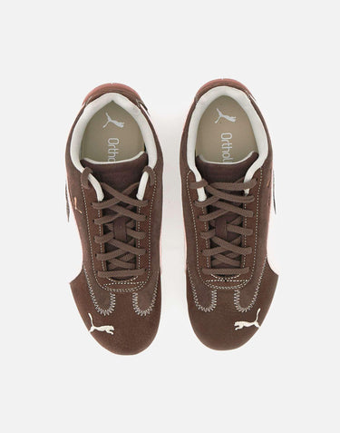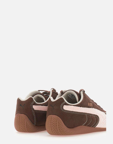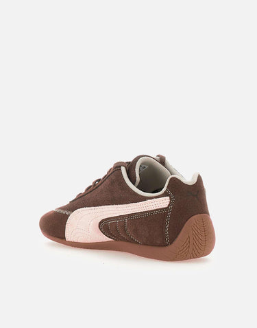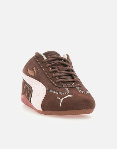 Puma "Speedcat" women's sneakers in brown, with an iconic design inspired by racing shoes. Featuring a low-profile, tapered silhouette and dynamic lines, they combine sporty style with urban appeal. They feature a lace-up closure, contrast stitching, and a rubber sole for optimal grip. A timeless model that brings motorsport aesthetics to the street with elegance and grit.