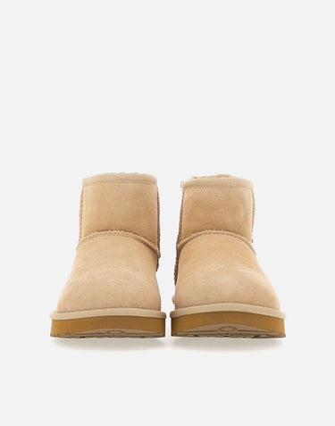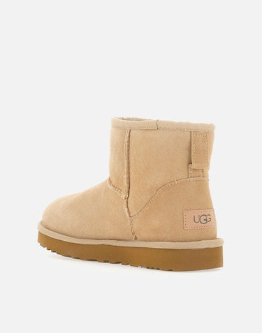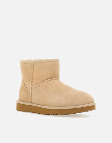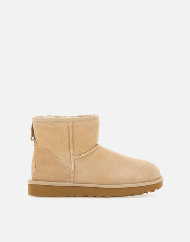 Ugg "W Classic Mini II" women's reverse suede boot, lighy sand color, sheepskin lining, GGplush insole, comfortable Treadlite sole by UGG, ankle height, rear pull tab, logo patch on back, shearling interior, ideal for cold season, 2 cm high SugarSole rubber sole. Regular fit.