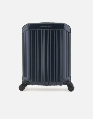 Piquadro "Pq-Light" polycarbonate trolley, 5 Years Warranty collection, navy blue color, four wheels, rigid construction, ultra slim, two rods, pocket for objects, single lock, TSA lock, mileage test, straight drop test, retractable handles.