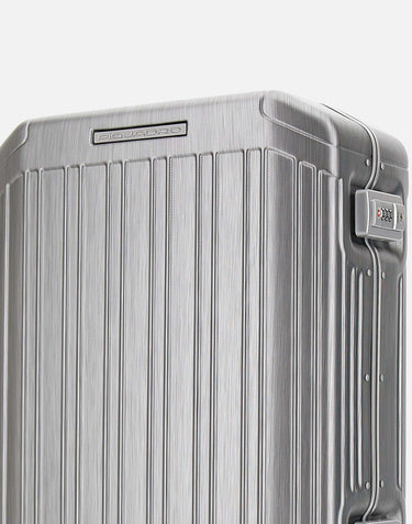 Piquadro "PQLM" polycarbonate and leather trolley, ultraslim,grey color with contrasting leather profiles, rigid, four wheels with TSA padlock, polyester lining, one single compartment, two rods, address tag. PQLM is business line of Piquadro suitcases, elegant and functional. Dimensions: 40cm length, 55cm height, 20cm depth. Weight:3466 gr