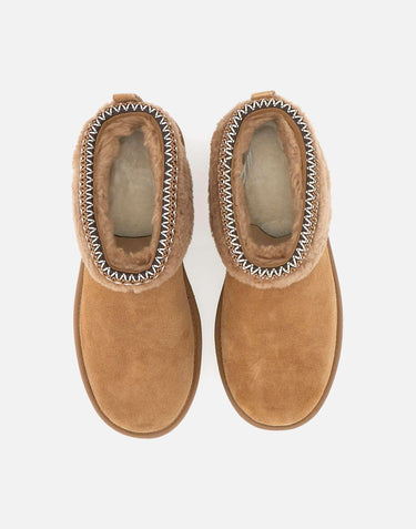 "Ultra Mini Maxi Curly" UGG women, camel, Ugg braid made with recycled polyester fibres, heel counter and mask in suede, padded collar, curled sheepskin upper (10 mm), mask lining in UGGplush (17 mm), made with regenerated wool and lyocell, UGGplush insole (17 mm), foam insole, cane EVA outsole sugar, fabric edge made with recycled polyester fibers (100%)