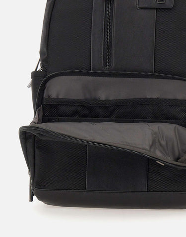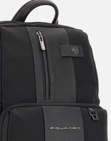 Piquadro men's backpack, black colour, top handle, one main compartment closed with zip, front logo patch, one external pocket with zip, metal logo, side slip pocket, adjustable shoulder straps, pocket on back, four internal compartments, two of which with zip . It can contain 14" notebooks. Measurements: height 39cm, width 29cm, depth 15cm. Weight: 985 gr.
